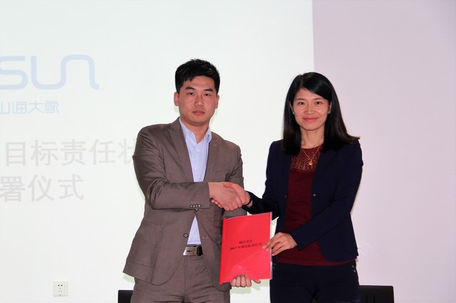 董事長相豐與法律合規(guī)部、工程管理部、市場部、發(fā)展研究院、采購部、成本控制部、行政人事部、財務運營部等各個職能部門以及泉海置業(yè)、營銷公司、資產(chǎn)管理公司等子公司等負責人簽署2017年目標責任狀。
