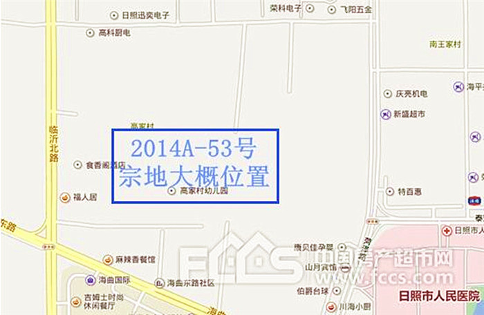 2014A-53號宗地位于臨沂路以東、泰安路以北(日照高家村),面積64019.7㎡(96.03畝),用途為住宅用地(商業(yè)≤13%),容積率≤3.35,綠地率≥35%,建筑密度≤23%。出讓年限商業(yè)用地部分40年,住宅用地部分70年,起叫價3.03億元,加價幅度為100萬元。據(jù)日照房產(chǎn)超市網(wǎng)了解,該地塊在2015年6月11日參與拍賣,起價為3.36億元,不過最終因無人報名流拍。