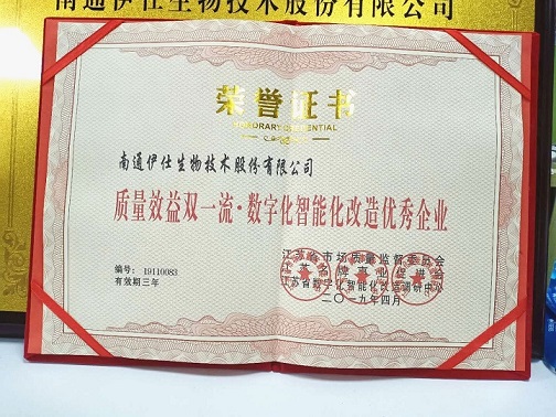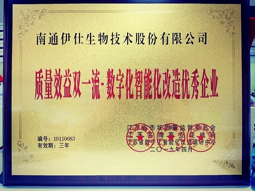 經(jīng)江蘇省市場質(zhì)量監(jiān)督委員會、江蘇省數(shù)字化智能化改造調(diào)研中心、江蘇名牌事業(yè)促進(jìn)會綜合調(diào)查審核評議,南通伊仕生物技術(shù)股份有限公司符合江蘇省質(zhì)量效益雙一流·創(chuàng)新驅(qū)動轉(zhuǎn)型升級優(yōu)秀企業(yè)的條件,被評為《江蘇省質(zhì)量效益雙一流·創(chuàng)新驅(qū)動轉(zhuǎn)型升級優(yōu)秀企業(yè)》。