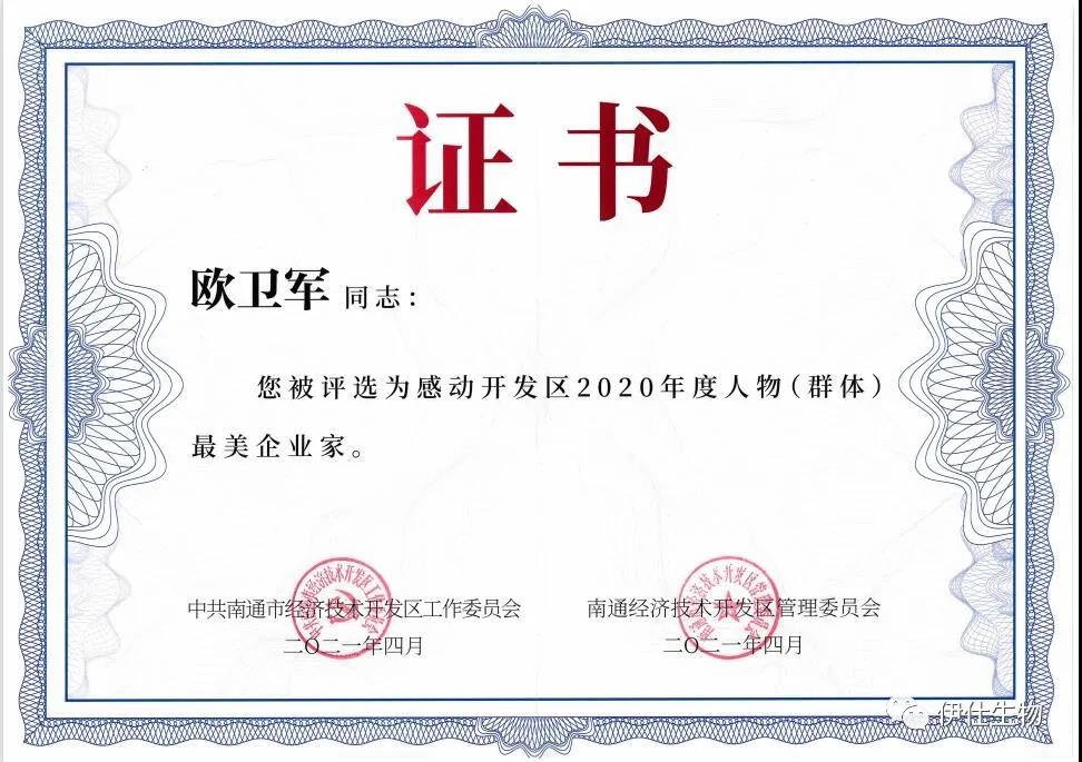 歐總是南通市中青年科學技術帶頭人,2020年度江蘇省企業(yè)“創(chuàng)新達人”,伊仕生物是南通市新冠肺炎疫情防控重點保障企業(yè)。
