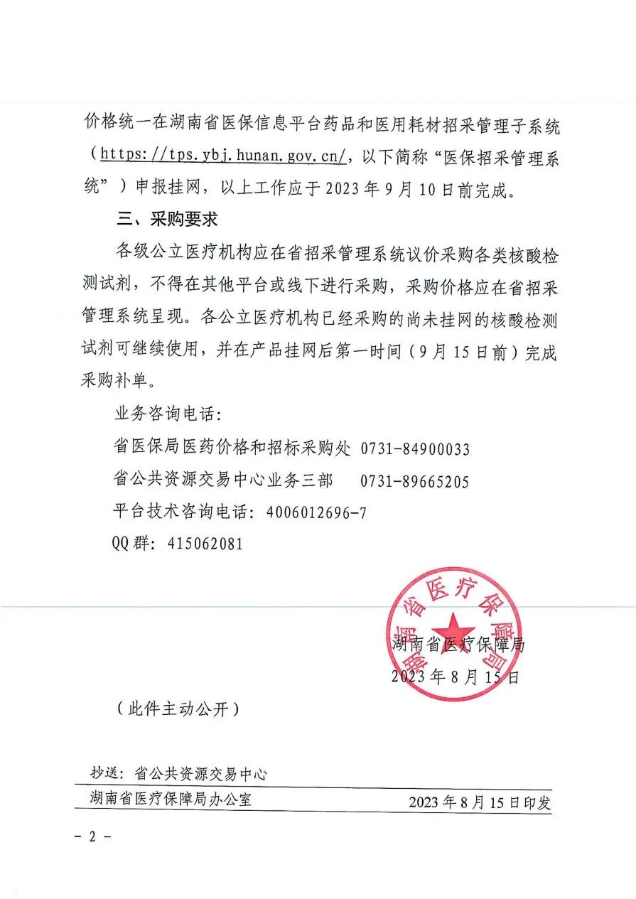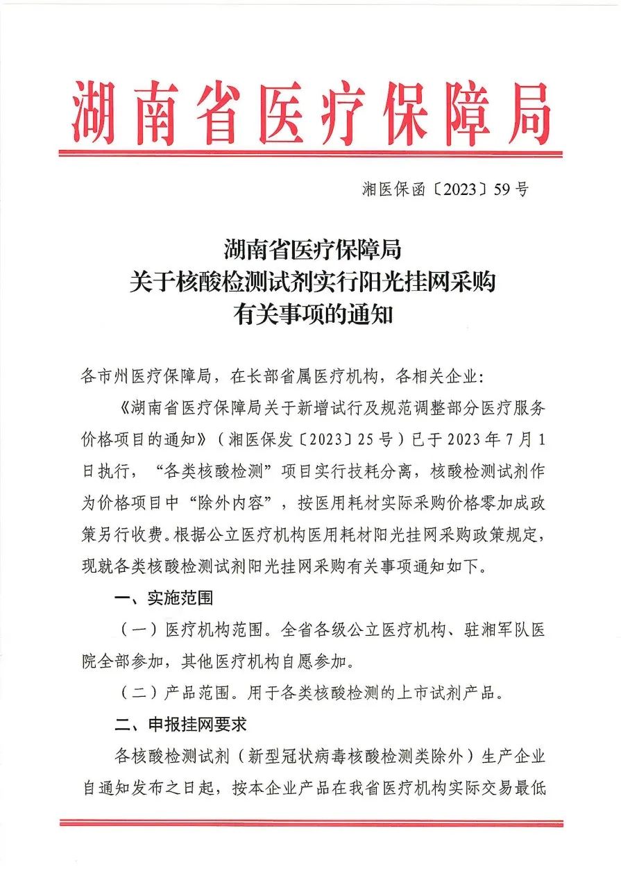 2023年8月16日,湖南省醫(yī)保局發(fā)布《關(guān)于核酸檢測試劑實行陽光掛網(wǎng)采購有關(guān)事項的通知》,要求相關(guān)生產(chǎn)企業(yè)將用于各類核酸檢測的上市試劑產(chǎn)品(新型冠狀病毒核酸檢測類除外)于2023年9月10日前,以湖南省醫(yī)療機(jī)構(gòu)實際交易最低價在湖南醫(yī)保招采管理系統(tǒng)申報掛網(wǎng)。