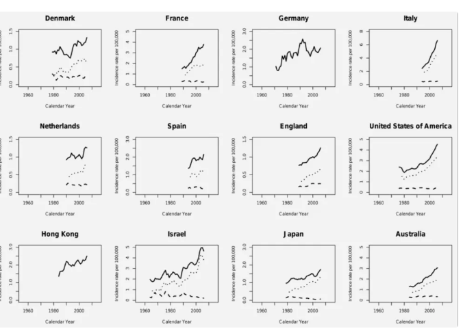 1960 年至 2007 年,在不同國家和地區(qū),男性甲狀腺癌發(fā)病率的總體趨勢呈明顯上升,圖片來源:參考文獻(xiàn)[4]