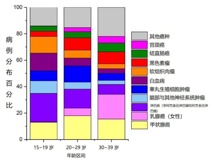 2012 年至 2016 年青少年和青壯年主要癌癥類型的病例分布(%),圖片來源:參考文獻(xiàn)[5]
