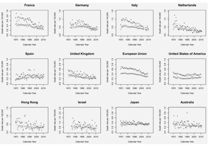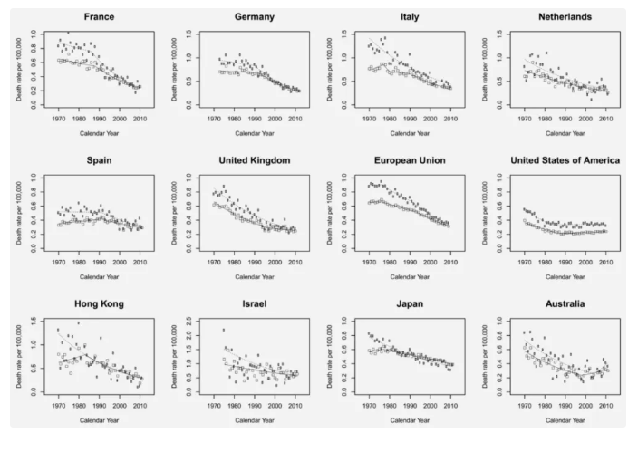 1970 年至 2012 年,在不同國家和地區(qū),女性甲狀腺癌死亡率穩(wěn)定下降,圖片來源:參考文獻(xiàn)[4]