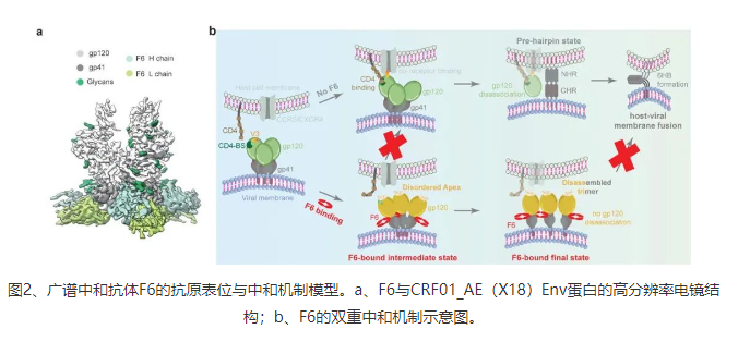 F6是第一株分離自CRF01_AE感染個體的廣譜中和抗體。研究團隊還通過高分辨率冷凍電鏡結構解析揭示了F6在Env蛋白上的詳細抗原表位(圖2a),并進一步通過結構分析與功能實驗驗證闡明了F6的新型中和機制(圖2b):F6一方面通過變構效應擾動Env蛋白三聚體Apex區(qū)域的穩(wěn)定性,破壞Env蛋白與宿主CD4受體的結合,另一方面通過誘導三聚體的解體來阻礙Env蛋白介導的病毒包膜與細胞膜的融合,進而抑制病毒對于宿主的入侵(圖2b)。
